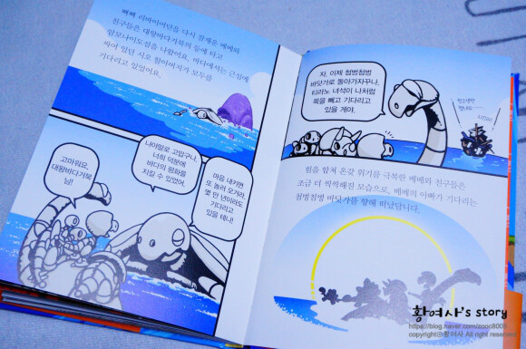 리바이어던을 잠재운 베베와 친구들은 대왕바다거북의 등에 타고 암모나이도섬을 나왔어요.