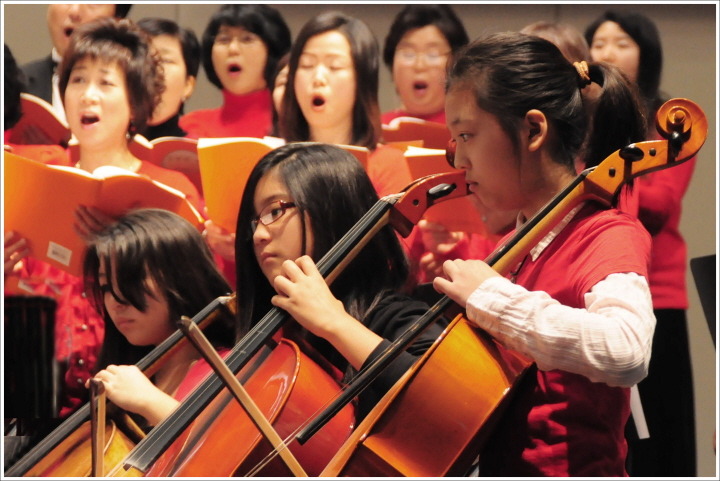 오케스트라와 성가대가 화음을 조절하고 있다.