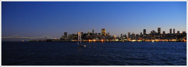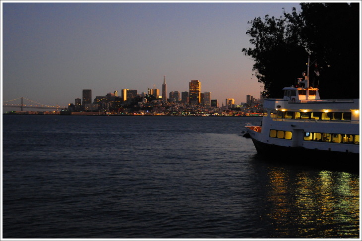 도시의 빌딩에도 조명이 빛난다. 오른쪽의 숲은 알카트래즈 섬이다.