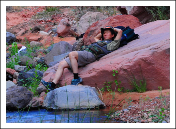 피곤함과 더위에 지친 에디가 패잔병 같은 모습으로 붉은 바위위에 널부러져 있다.
