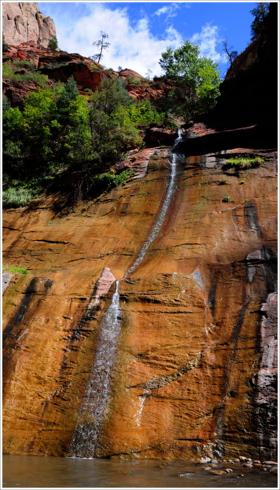벽을 타고 흘러 내리는 작은 폭포위로 파란 하늘이 아름답다.
