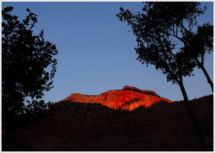 높은 산봉우리엔 어느새 태양빛을 받은 붉은 바위산이 더욱더 짙은 붉은빛으로 불타오르고 있다.