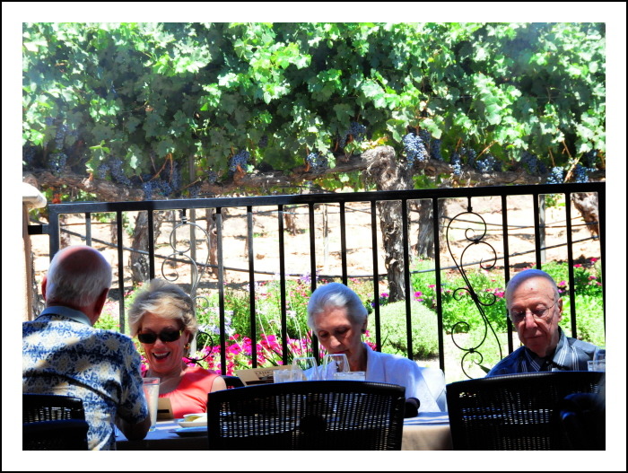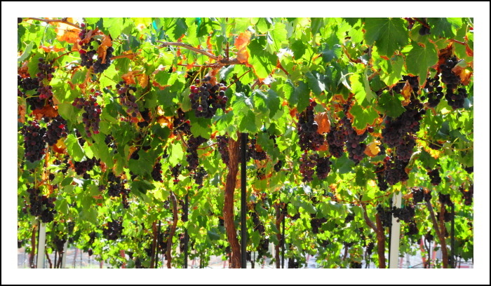 잘 익은 포도송이가 주렁주렁 열린 포도밭가에서 여유를 즐기는 사람들.....