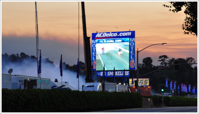 전광판 뒤로는 브레아에 난 화재현장에서 솟아오르는 연기가 시커멓게 솟아 오르고 있습니다.
