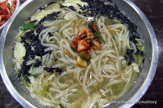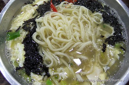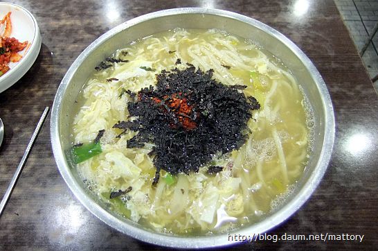 멸치 국물에 달걀을 풀어낸 익숙한 맛이고 면발은 일정한 크기로 부드럽습니다