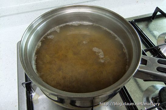 분량의 다시마국물을 끓이다가 가쓰오부시를 넣고 불을 끄고 10분쯤 두었다가 체에 밭칩니다