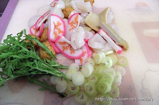 생우동팩(2개),어묵,꽃어묵,곤약,대파(1/2대),쑥갓,쯔유(2큰술),맛술(2큰술),소금(약간),후춧가루(약간)