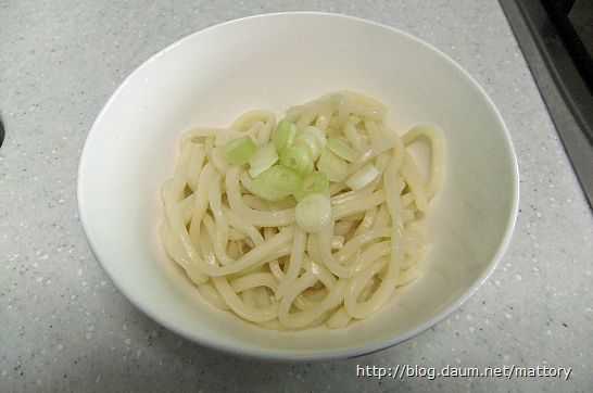 생우동면은 끓는 물에 2분쯤 삶은 후에 대파와 함께 그릇에 담습니다