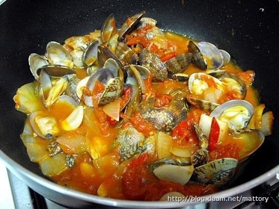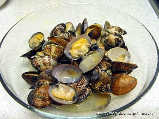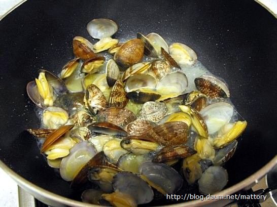작하게 붓고 센불에서 끓이다가 바지락 껍질이 벌어지면 불을 끄고 통후추는 제거합니다