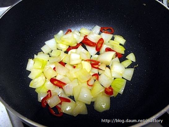 팬에 올리브오일을 두르고 양파와 홍고추를 볶습니다