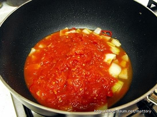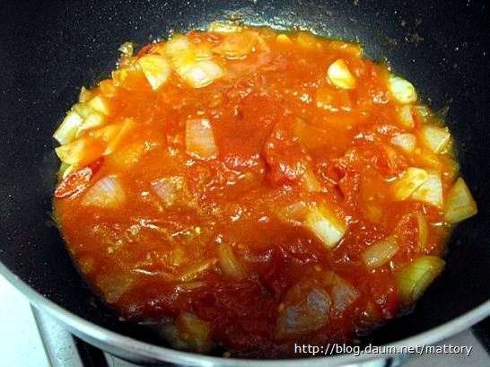 다음에 토마토소스와로 농도를 맞춘 후 약한 불로 10분 이상 끓입니다