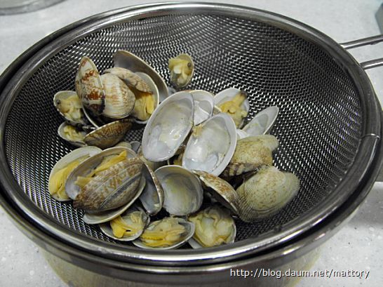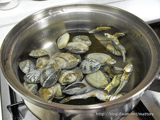 냄비에 바지락,다시마,멸치를 넣고 15분 정도 국물을 우려냅니다