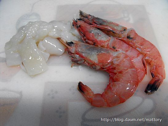 오징어는 적당히 썰고 새우는 등쪽에 있는 내장을 제거합니다