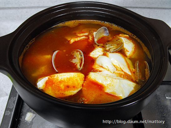 연두부와 바지락을 넣은 후에 다시 국물을 붓고 끓입니다