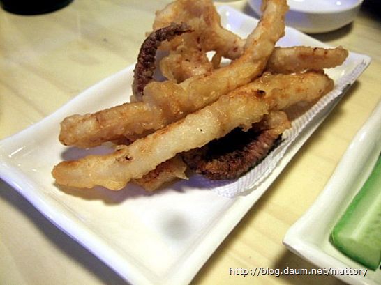 생선회가 나오기 전에 바로 튀겨낸 오징어를 가져다줍니다