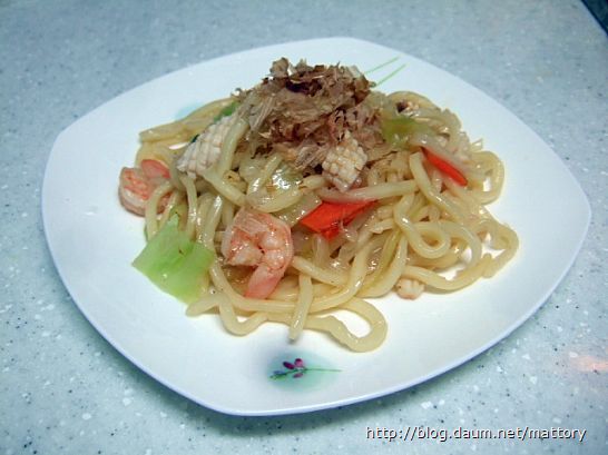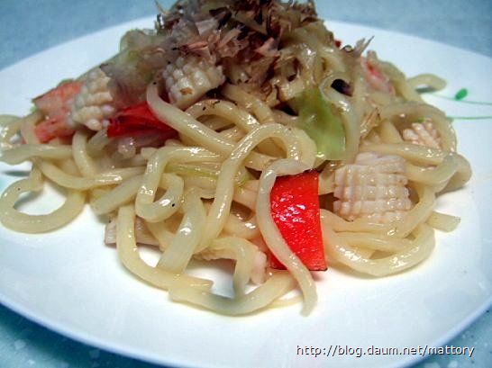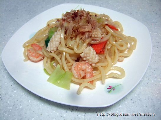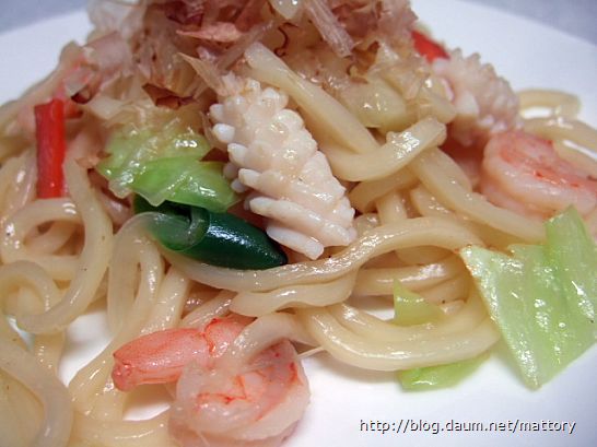 마트에서 시판되는 우동면으로 해물야끼소바를 만들었습니다