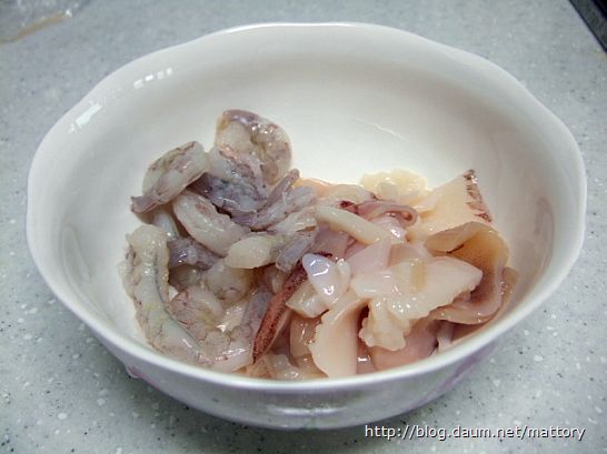 오징어와 새우는 깨끗이 씻은 후 오징어는 칼집을 냅니다