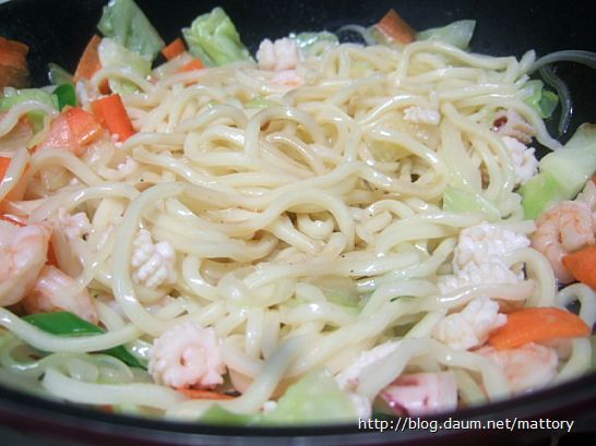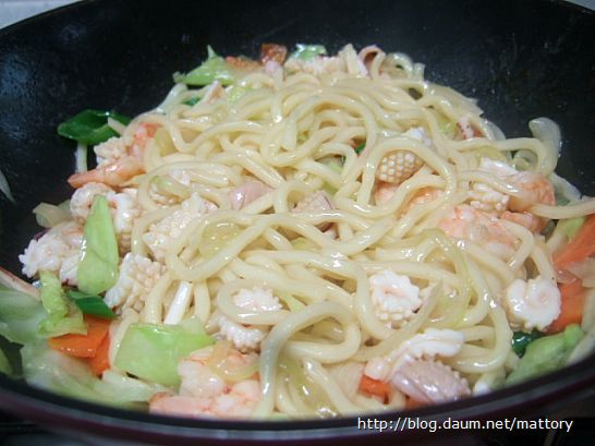 센불에 볶습니다 우동면은 나중에 볶기 때문에 물에 너무 익히면 안 되겠지요