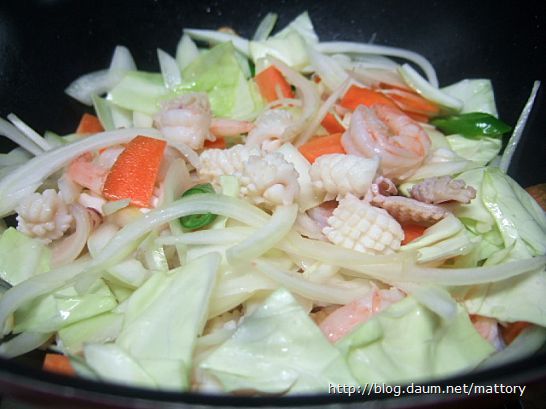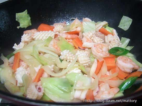 새우와 오징어를 적당히 볶다가 야채를 넣고 볶습니다