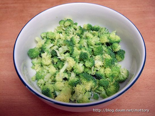 브로콜리는 송이를 작게 떼어 끓는 물에 소금을 넣고 살짝 데친 뒤 찬물에 헹궈 물기를 뺍니다