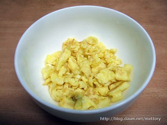 달걀은 그릇에 풀고 소금으로 간을 한 후 스크램블을 만듭니다