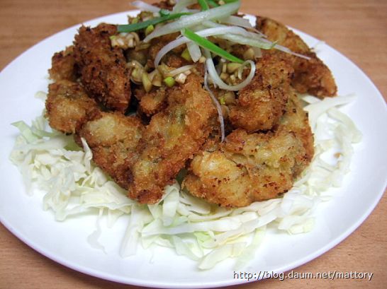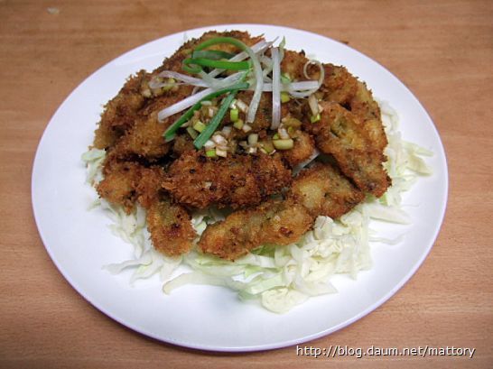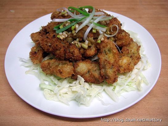 접시에 채썬 양배추를 넣고 굴튀김을 올린 다음 간장소스를 적당히 뿌리고 파채를 조금 얹습니다