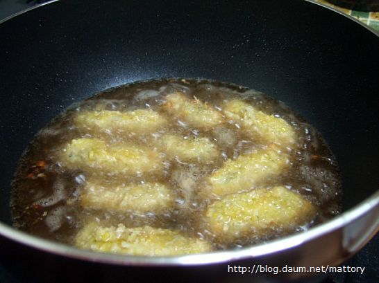 튀김옷이 노릇하게 될 때까지 튀긴 후에 기름을 뺍니다