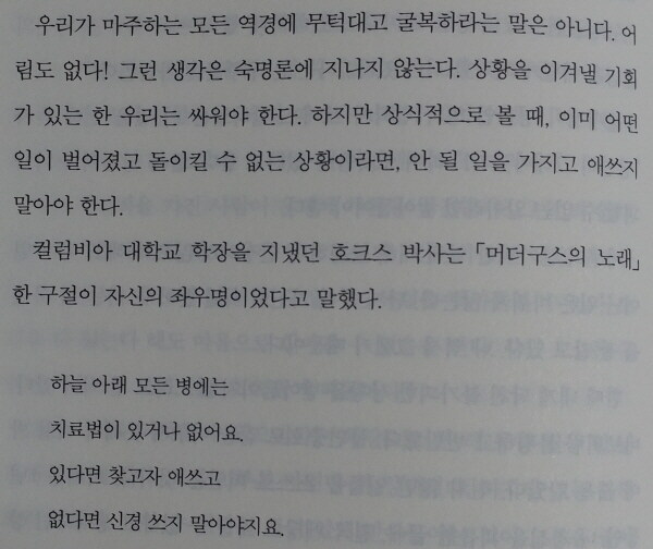 이 책에서는 이 과정을 하나로 묶어 무시무시한 이야기를 독자에게 던집니다. 필연적으로 비극으로 끝나게 되는 결말을 피하고 싶다면 지금 현재의 지옥을 택하라구요. 죽기보다 힘든 결정 앞에 서계십니까? 내가 도저히 넘어설 수 없을 것 같은 큰 산 앞에서 망설이고 계십니까? 오늘의 어려움을 택하는 자만이 종말의 불행을 피할 수 있습니다. 미래의 안도감을 가불해쓰고 종국적으로 멸망으로 빠져드는 한심한 인생을 더이상 살지 마십시오. 지금 미치도록 불안하고 괴롭더라도 오늘 내게 주어진 인생의 짐을 기꺼이 감당해내는 어른이 되시길 바랍니다.