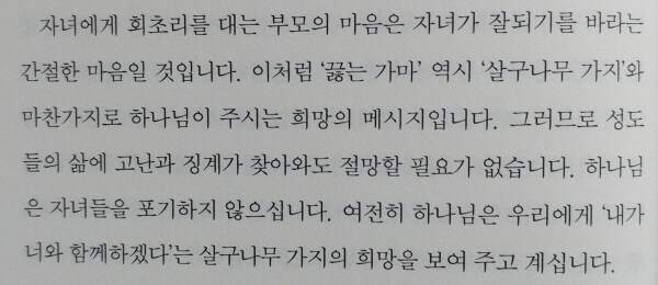 절망 속에서 절망을 보는 자는 무너질 것입니다. 그러나 절망 속에서 하나님의 "네가 무엇을 보느냐?"는 질문을 받아 자신의 시력을 교정하는 자는 살 수 있습니다. 하나님의 질문은 우리의 가치관을 새롭게 정립함과 동시에 우리가 놓치고 있던 우리의 잘못들을 통렬하게 지적하고 찔러 쪼갭니다.