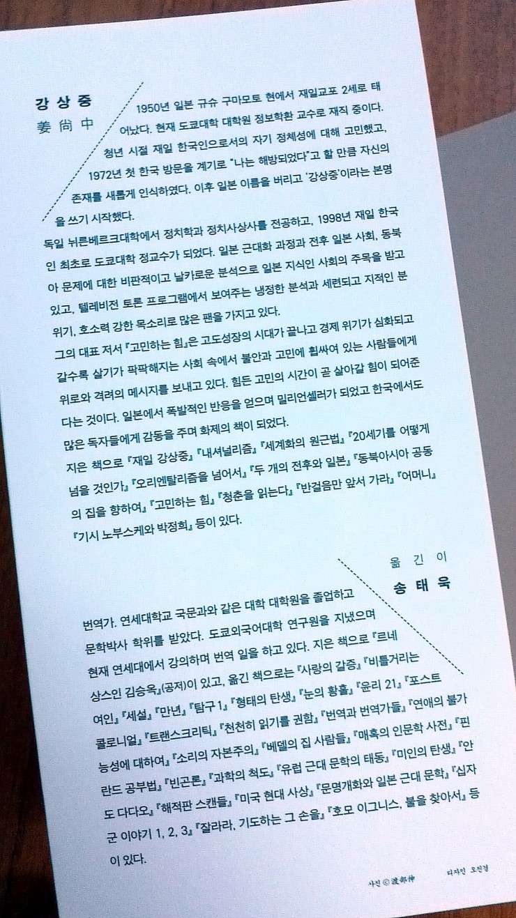 얼핏 들어본 이름이지만 자세히는 몰랐던 인물이다. 저자 소개란을 보면 1950년 일본 규슈 구마모토 현에서 재일교포 2세로 태어나서 현재는 도쿄대학 대학원 정보학화 교수로 재직 중이라 한다. 조금 더 내려가니 [고민하는 힘]이란 책을 지은 저자가 바로 이 사람이었다. 힘든 고민의 시간이 곧 살아갈 힘을 준다는 이야기를 담았던 서적인데 일본에서도 역시나 세계경제가 불황이고 자국 상황도 마냥 좋은 것만은 아니어서인지 독자들을 감동시켰고 밀리언셀러로 등극했다. 책에서 느껴지는 철학적이면서도 깊은 사유가 느껴졌는데 이미 일본에서는 비판적이면서도 냉정한 분석과 세련된 분위기로 지식인 사회의 주목을 받고 있다고 한다.