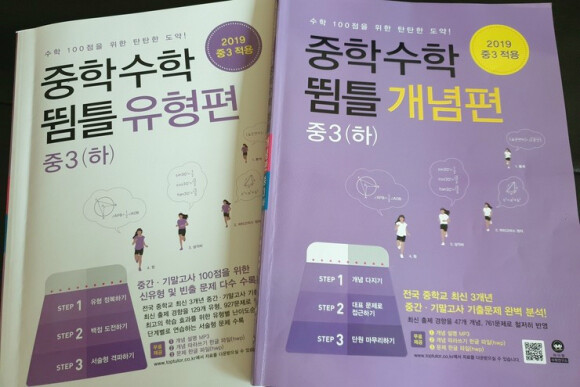 중학 수학 뜀틀은 개념편과 유형편 2권으로 구성되어있어요.