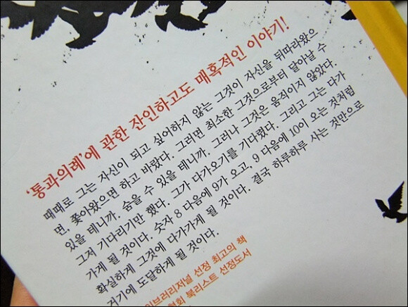 마을 남자라면 누구나 모두 열살이 되는 해에 상처 입은 비둘기의 목을 꺾어 숨을 끓는, 링어가 되어야만 한다는 것, 그래야만 어른이 된다라고 생각한답니다.