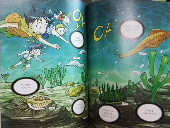 아 무사하구나 느끼는 순간 아이들의 모험은 다시 시작되고 3억년전 생명체인 딱딱한 겉껍질을 실제 만져보면서 아~ 이래서 쉽게 화석이 될 수 있었구나, 그래서 우리가 많은 화석들을 만날수있는거였구나 생생한 경험으로서 고생명체들을 만납니다.