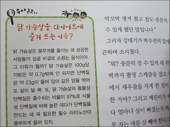 우리 아이들도 마찬가지였는데 그래서 특히 더  명탐정  과학수사파일 4권의 이야기를 더욱 더 흥미롭고 재미있을 수 밖에 없었습니다. 또한 그러한 연예인들을 보면서 더 이상 낮설지 않게 된 황금비율이라든지 엠피쓰리, 시시티브이라는 용어들 , 무서우면 머리카락이 쭈뼛 선다 , 119 구급대원은 어떤 일을 할까 , 스토커가 뭐야,등의 상식들, 닭가슴살을 다이어트에 즐겨 쓰는 이유등에 대한 지식까지 두루두루 만나게 되었지요.