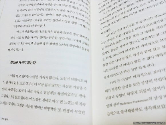 작가는 나이듦을 느낄때를 첫맛이라고 이야기 했다. 영원불멸할거 같은 젊은 시절을 보내고 어느날 갑자기 나이가 들었다는 생각이