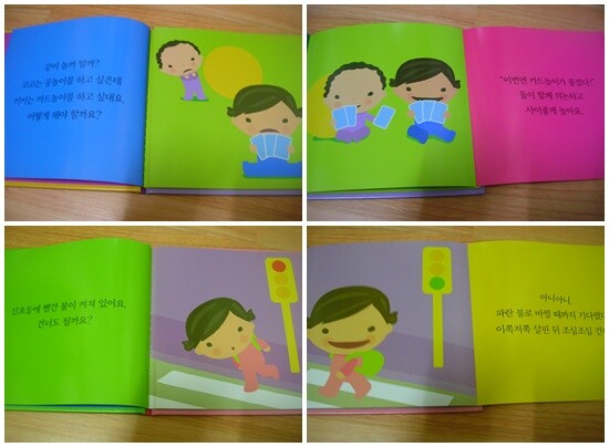 질서를 지켜요와 사이좋게 지내요는 한참 친구들과 많이 싸우고 공공질서에 대한 개념이 없는 지금 시기에아이들에게 질문과 답을 하면서 내가 한 행동이 잘못된 행동이라는걸 알려주면서 바른행동을 배우게 하는것 같네요..한가지 아쉬운점은 신호등에 빨간불이 켜저있어요 건너도 될까요?라는 부분에서 파란불로 바뀔때까지 기다렸다