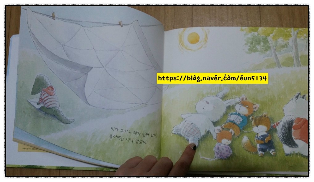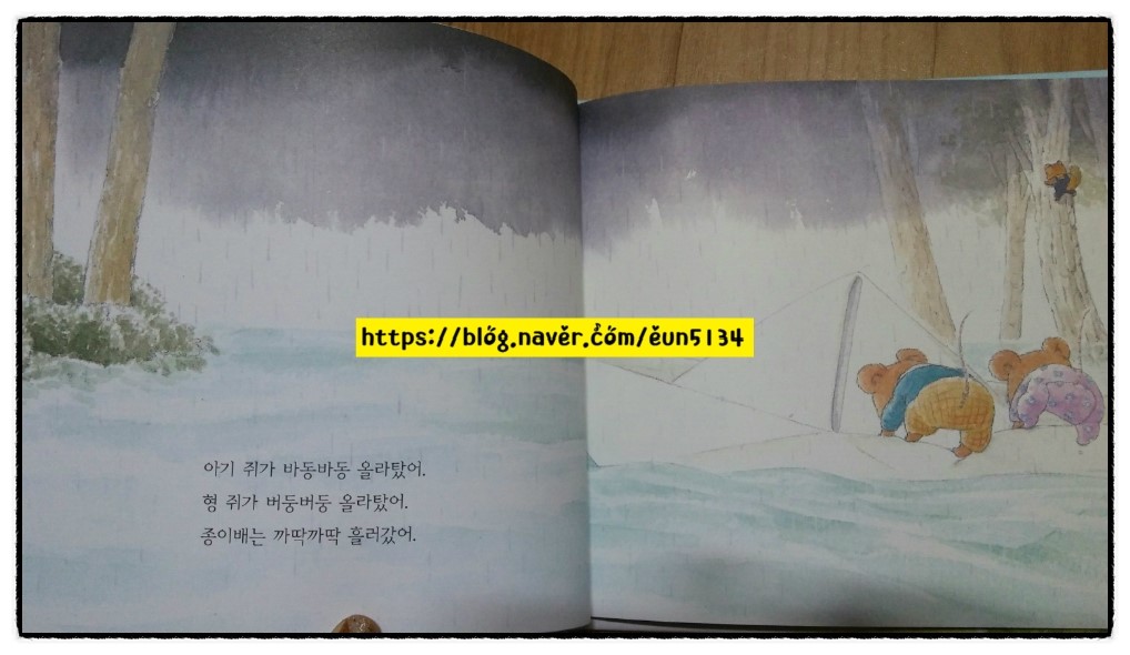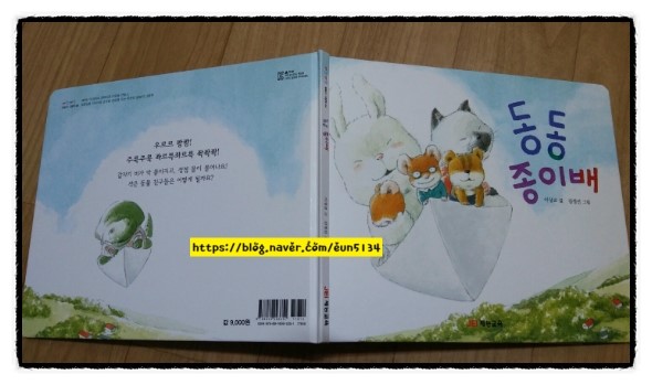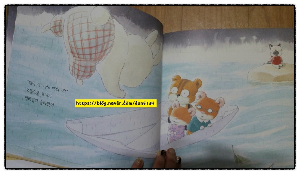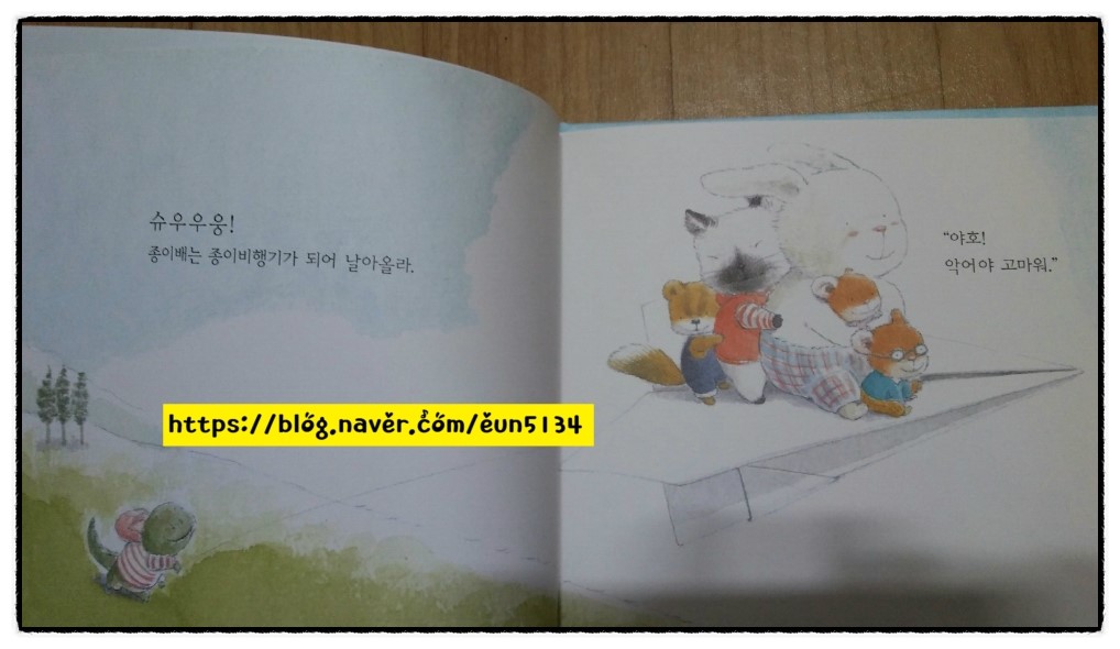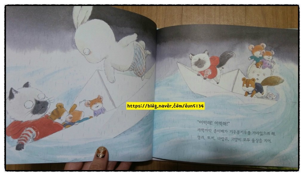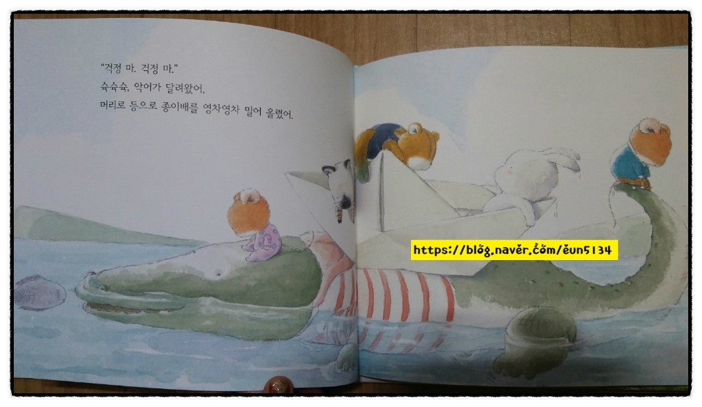 표지 앞면에는 동물들이 종이배를 타고, 뒷면에는 악어가 타고 있네요.