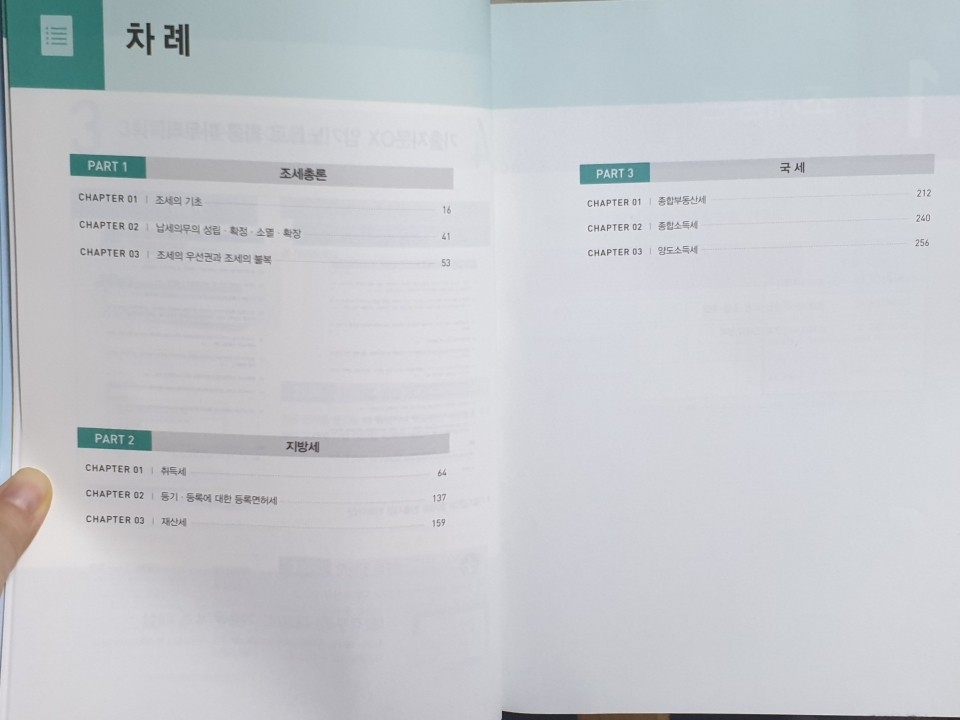 공인중개사 부동산세법은 공인중개사 2차 시험과목 중의 하나로 2차시험 2교시에 해당된다. 부동산 세법은 부동산에 관련된 세법으로 상속세, 증여세, 법인세, 부가기치세를 제외 한 부동산에 관련된 모든 세법이라 하겠다. 에듀윌 공인중개사 2차 출제가능 문제집은 크게는 조세총론, 지방세, 국세로 3개의 PART로 구성되어 있다. 각 한개의 PART당 각각 3개의 CHAPTER로 구성되어 있다. 위의 사진을 보면 더 자세한 목차를 알 수 있다.