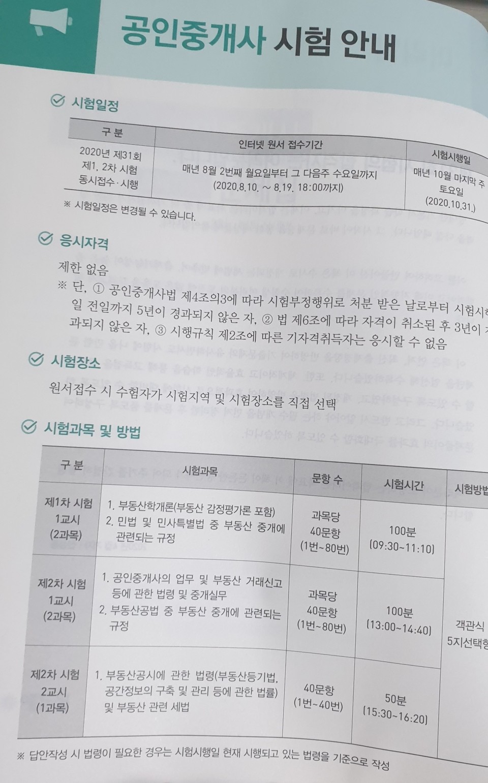 부동산중개사에 관심이 있으시면 참고해 주시길 바라는 마음이다. 나역시 처음하는 부동산 중개사 시험 준비로 계속 체크를 하고 있기에 혹시하는 마음으로 책에 나와있는 공인중개사 시험 안내를 사진으로 올린다.
