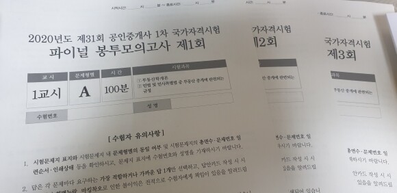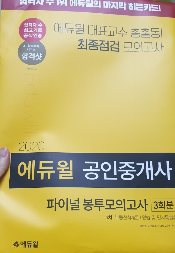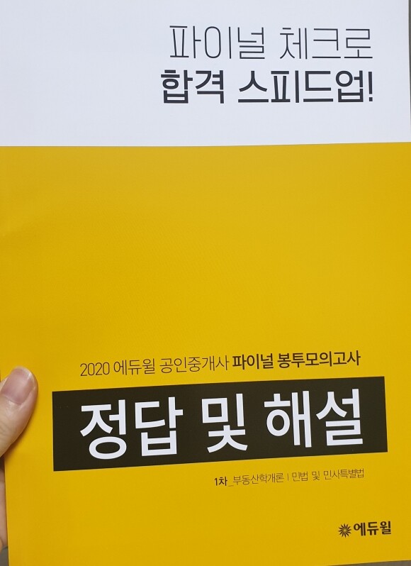 [서평] 2020 에듀윌 공인중개사 1차 파이널 봉투모의고사(9791136006455) 2020년 제 31회 공인중개사 시험이 얼마 남지 않았다.이번 2020년 제 31회 시험일정은 2020년 8월 10일부터 8월 19일까지 인터넷 원서 접수기간을 갖았으며 2020년 10월 31일 토요일에 제1,2차 공인중개사 시험을 동시에 시행할 예정이다. 인터넷 원서 접수할 때에 선택한 장소로 가서 응시하면 된다. 이제 두달 정도 남은 기간 동안에 그동안 학습한 내용을 점검해보는게 좋겠다고 생각했다. 처음보는 공인중개사 시험이므로 시험현장과 똑같은 연습을 위해서 에듀윌 공인중개사 1차 모의고사를 준비해 보았다. 공인중개사 1차 문제집을 어느정도 풀어보았다면 그 다음으로 공인중개사 1차 파이널 봉투모의고사를 풀어보면 더 좋겠다. 정말 시험을 보는 것처럼 똑같은 느낌을 갖고 풀 수 있었다. 노란 봉투안에 제1차 공인중개사 모의 시험지는 총3회분이 들어있다. 답안카드도 함께 들어 있어서 연습해 보기에 용이하다. 답안지 뒤장에는 수험자 유의 사항도 있으니 미리 한번 읽어보면 도움이 될 것 같다. 또한, 답안카드 작성 시 유의사항도 있으니 미리 한번 읽어보면 도움이 될 것 같다. 시험장에 갈 때 마킹펜도 미리 준비해서 한번 연습해 보았다. 이제 시계로 시간을 체크하면서 문제를 실전처럼 풀어보았다. 집에서 해보는 모의고사라서 인지 생각보다 편안한 마음으로 풀 수 있었다. 편안한 마음으로 풀어서인지 시간이 조금 부족했다. 조금 더 긴장을 하고 풀어야겠다.다 풀어보았다면 답안지를 보고 채점을 꼼꼼하게 해본다.채점을 해본 후 점수를 내보는 것도 좋겠다.2020 에듀윌 공인중개사 1차 파이널 봉투모의고사로 시험 때처럼 모의시험을 치루어보았다. 부동산학개론과 민법, 민사특별법의 평균이 60점 이상만 되면 합격인데 생각보다 점수가 좋지 않았다.다시 틀린 문제를 잘 살펴보아야겠다.다행히 시험을 준비할 수 있는 기간이 두달 더 남았으니 더욱 꼼꼼히 틀린부분을 중점으로 살펴보아야겠다.이렇게 모의고사로 준비할 수 있어서 내가 어느 부분이 부족한지 매우 도움이 되었다.이 리뷰는 책을 제공받아 직접 읽고 작성했음을 알려드립니다.