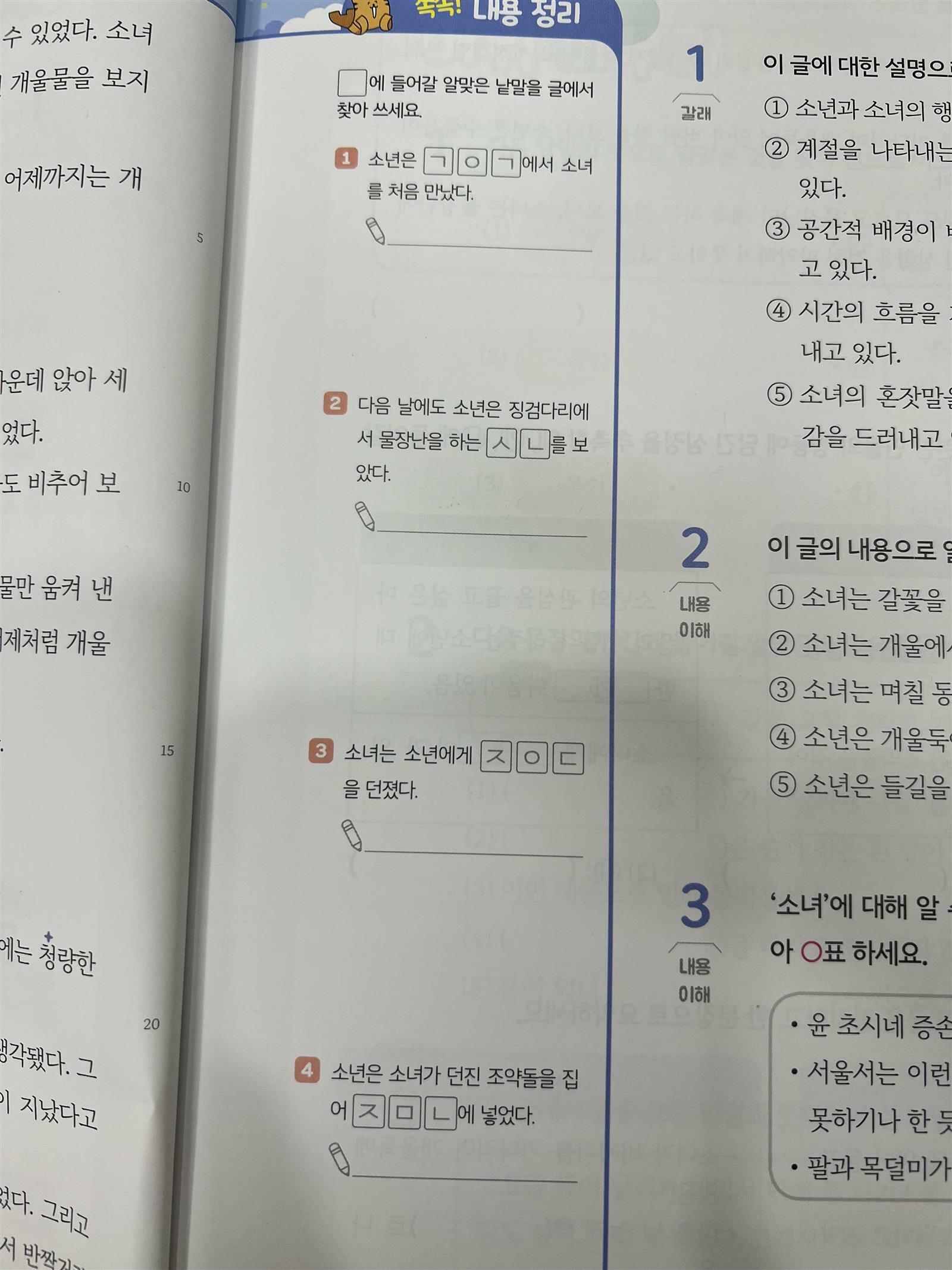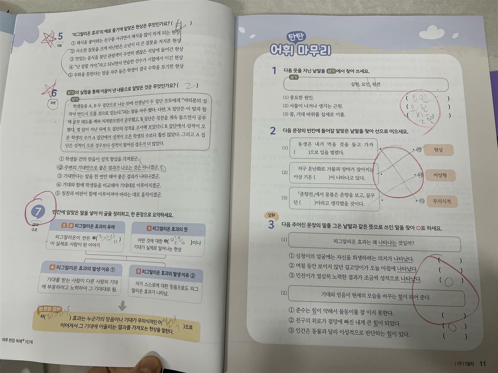독해교재보다는 부담이 적어서 아이들이 집중해서 하루 분량을 풀어 내는 것이 수월합니다. 아이들의 어휘력에 차이가 있기 때문에 교재를 살펴보시고 아이 수준에 맞는 교재부터 풀어나가면 좋을 것 같습니다.