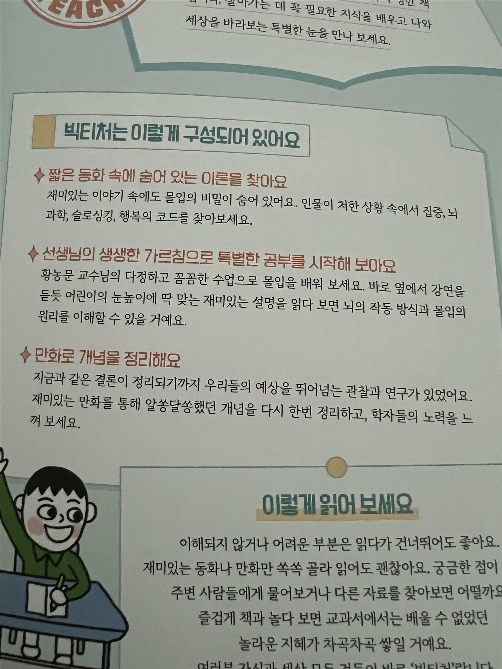 출판사로부터 도서를 제공받아 직접 읽고 작성한 리뷰입니다. ‘빅티처 황농문의 몰입 발전소’ 책을 읽어 보았습니다. 이 책은 어린이를 위한 뇌과학 책 같더라구요. 평서에 뇌과학 관련 서적을 읽으면서 아이들이 이해하기 좋은 책도 필요하겠다는 생각을 했습니다. 바로 이 책이 아이들에게 알기 쉽게 알려주는 뇌과학 관련 책입니다. 복잡하고 어려운 이론적인 것은 단순하게 만화로 알려주고 친절하게 아이들의 시각에 맞춰서 설명해 줍니다. 특히 이 책의 저자 황논문 교수님은 몰입의 대가라고 하십니다. 그래서 이 책은 몰입에 대한 이야기가 주를 이룹니다. 몰입이라는 것을 이해하기 위해서는 뇌에 대한 이해도 필요합니다. 어렵게만 생각했던 뇌 이야기를 아이들의 상황에 맞게 설명해주니 참 좋은 것 같습니다. 공부를 하기 위해 필요한 몰입에 대해서도 아이들이 좋아하는 게임을 예로 들어서 설명해 줍니다. 게임은 너무나도 몰입이 잘 되는데 공부는 몰입이 쉽지 않지요. 또한 위험한 상황이 닥쳤을 때 순간적으로 몰입해서 목적을 위해 행동하게 되는 것도 이야기해 줍니다. 평소에 느낄 수 있었던 일을 이론과 과학적으로 설명해주니 이해하기 좋은 것 같아요. 그리고 공부를 몰입해서 하기 위해 어떻게 해야하는지 방법도 알려줍니다. 아이들이 이러한 방법을 사용해가면서 몰입의 기쁨을 느낀다면 엄마들의 잔소리도 많이 줄어들 것 같습니다. 초등중학년 아이들부터는 같이 읽어보면 좋을 것 같네요. 저도 아이와 함께 읽고 이야기 나눠보고자 합니다. 초등 고학년 아이들은 스스로 읽고 이해하기 좋을 것 같아 추천합니다. #빅티처황농문의몰입발전소 #돌핀북 #황농문 #컬처블룸 #컬처블룸리뷰단