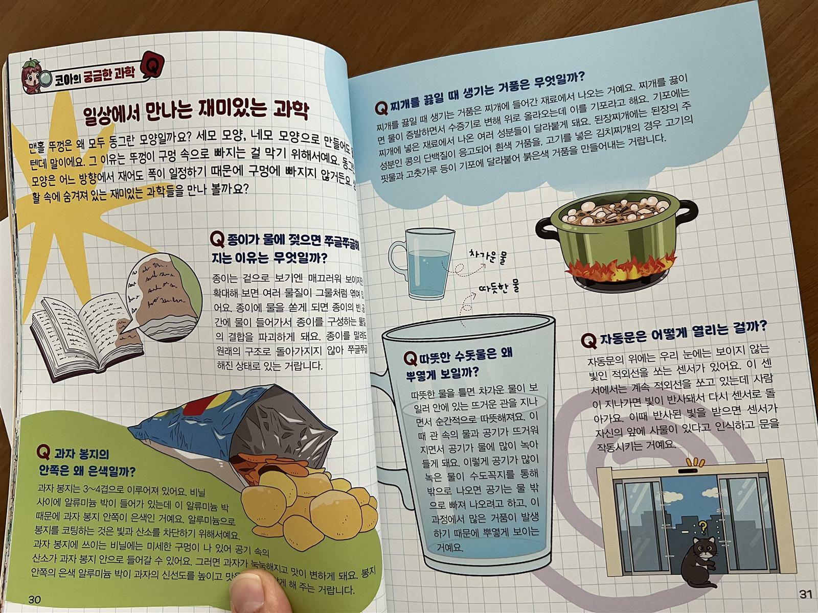 출판사로부터 도서를 제공받아 직접 읽고 작성한 리뷰입니다. '코아tv 엉뚱 과학' 시리즈 책 1권 기묘한 왕국의 위험한 초대를 읽어 보았습니다. 평소에 아이가 과학상식 만화를 좋아해서 이 책을 선택했습니다. 이 책은 유튜브채널 코아tv의 첫 오리지널 과학 상식 코믹북입니다. 코아tv를 몰랐다고해도 읽어보면 너무 재미있어서 빠지게 되는 책입니다. 만화형식이라서 아이들이 부담없이 들고 읽어나갈 수 있습니다. 한 챕터가 끝날 때마다 과학상식이 담겨있는데 읽기 어렵지 않습니다. 한 장이지만 알찬 과학상식이라서 집중해서 잘 봅니다. 무엇보다 아이들이 평소에 궁금해 하던 생활속의 과학 이야기라서 평소에 과학을 좋아하지 않던 아이들도 잘 볼 것 같더라구요. 저희 아이는 평소에 과학을 좋아해서 이런 저런 질문들을 많이 하는데 이 책에 그런 질문에 대한 답이 있었습니다. 맨홀 뚜껑이 왜 동그란 모양인지 한 번쯤 생각해 보셨나요? 생각해보니 세모모양으로 해도 될 것 같은데, 다 이유가 있더라구요. 이 책을 펼쳐 보기 시작하면 순식간에 읽을 수 있는 그런 책입니다. 조금은 딱딱한 배경지식이야기 책이라서 이렇게 만화형태로 아이들이 즐겁게 익히는 것이 좋은 것 같아요. 줄글책도 읽어 가면서 가끔은 만화로 배경지식을 쌓아가면 아이들의 성장에도 도움이 될 것 같습니다. 이번에 처음 나온 코아tv 시리즈 책을 보니 앞으로 계속해서 나올 것 같습니다. 아이들의 취향에 맞게 재미있고 유익한 내용을 담고 있더라구요. 앞으로 2권도 쭉 쭉 나와서 아이들의 과학 상식도 늘려주고 엄마들도 함께 웃는 육아 할 수 있으면 좋겠네요. 아이들이 좋아할만한 과학 상식 책 찾으시는 분들에게 코아tv 엉뚱과학 책을 추천하고 싶습니다. 아이들이 더 찾는 그런 책인 것 같아요. 이번 첫 출간이라서 초판한정 스티커도 증정되니 아이들이 더 신날 것 같습니다. #코아tv엉뚱과학 #기묘한왕국의위험한초대 #서울문화사 #코아tv #책세상 #맘수다 #책세상맘수다카페