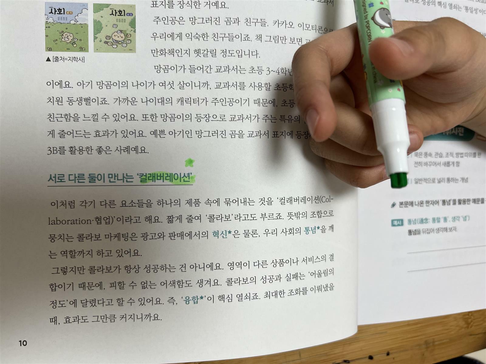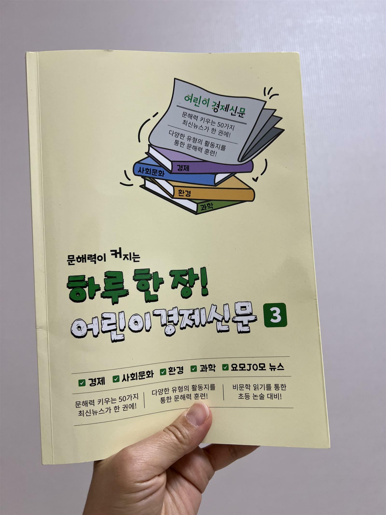 출판사를 통해 도서를 제공받아 직접 읽고 작성할 리뷰입니다. '하루 한 장 어린이 경제신문3' 책을 아이와 읽어 보았습니다. 아이와 신문을 꾸준히 봐야 하는데 솔직히 쉽지 않더라구요. 특히 초3부터는 사회 과목도 생겨서 경제관련 기사나 신문을 보는 것이 많이 도움이 된다고 합니다. 어린이 경제신문 목차를 살펴보면 총 4파트로 나눠져 있습니다. 경제분야는 20개의 신문기사가 실려있고 나머지 파트는 각 각 10개 기사로 이루어져 있습니다. 제목들만 봐도 흥미로운 주제가 많습니다. 특히 우리 사회전반에 걸쳐서 일어나는 이야기와 기사라서 아이들이 직접적으로 듣고 볼 수 있다는 점이 좋더라구요. 내가 사는 사회의 이야기를 좀 더 구체적으로 살펴보고 생각해 볼 수 있는 기회를 주는 책이라서 아이와 매일은 못하더라도 꾸준히 해나가면 도움이 될 것 같습니다. 첫 번째 주제를 가지고 아이와 이야기 나눠 봤습니다. 마침 아이가 배우는 교과서에 관련된 주제였는데 교과서에 '망곰이' 캐릭터를 그려넣은 이야기입니다. 왜 이런 캐릭터를 넣었는지, 그냥 지나칠 수 있었던 것을 다시 살펴볼 기회가 되었습니다. 또한 콜라보 마케팅이라는 새로운 경제 개념도 배우고 어떤것이 컬래버레이션 인지 정확히 배울 수 있어서 흥미로웠습니다. 기사는 한 쪽 분량이라서 초3 아이부터는 스스로 읽어 나갈 수 있습니다. 저는 형광펜을 들고 중요하다고 생각하는 중심 단어 위주로 선을 그어보게 했습니다. 그냥 읽는 것 보다 집중하기 좋고 옆에 있는 문제를 풀어보는데 도움이 많이 되더라구요. 처음 들어보는 개념과 어휘가 나와서 아이들이 생소하게 느낄 수 있지만 이러한 사회 용어를 배우기에 경제신문이 많이 도움이 되는 것 같습니다. 문제도 분량이 적어서 퀴즈처럼 가볍게 풀고 나만의 문장도 만들어 보면 기억에 더 오래 남을 것 같네요. 매주 어린이 경제신문을 통해 문해력이 쑥쑥 성장하는 올해 되길 응원합니다. #하루한장어린이경제신문3 #나이스에듀 #어린이경제신문 #진로N #초등문해력 #초등사회 #책세상 #맘수다 #책세상맘수다카페