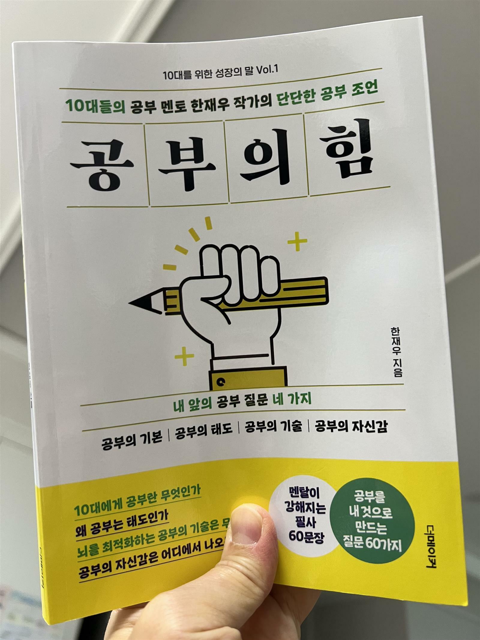 컬처블룸을 통해 출판사로부터 도서를 제공받아 직접 읽고 작성한 리뷰입니다. '공부의 힘' 책을 읽어 보았습니다. 이 책은 공부법과 자기계발에 대한 연구를 지속해 온 한재우 작가의 책입니다. 공부란 무엇인지 한 번쯤 생각해 보았을 것입니다. 학창시절 공부를 하면서 참 힘들다고 생각했는데 돌이켜보면 가장 쉬운 것이지 않았나? 생각이 듭니다. 하지만 청소년시기에는 잘 알기 어려운 것 같습니다. 이 책은 청소년을 위한 성장의 말들이 60가지 담겨있습니다. 공부를 하는데 힘들고 어려운 것은 당연합니다. 몸이 힘든것이 아니라 마음이 힘든 것이라고 작가는 이야기하고 있습니다. 그렇기 때문에 마음을 단단히 붙잡는 것이 아무래도 중요한 것 같습니다. 책에는 4가지 챕터로 나눠져서 공부 조언을 담고 있습니다. 책을 활용하는 방법은 내가 원하는 주제를 펼쳐서 보기 시작해도 된다고 합니다. 그리고 일정시간과 장소에서 꾸준히 하는 것을 추천하고 있습니다. 공부조언을 읽고 중요한 문장을 필사하고나서 질문에 대한 답을 적어보는 것이 하루 분량입니다. 하루분량이 많지 않아서 매일 하기에 좋을 것 같습니다. 일단 진지하게 집중해서 임해야 한다고 합니다. 그래야 더 잘 새겨지는 효과가 있다고 합니다. 지금 내가 어떻게 공부해야 할 지 모르겠고, 마음이 다잡아 지지 않는다면 이 책을 적극 추천합니다. 무엇부터 시작해야 할 지 막막한 마음을 일으켜 세워주는 글귀들이 있어서 꾸준히 하다보면 마음의 힘듦이 조금 줄어들지 않을까요? 10대들의 공부 멘토로 한재우 작가의 '공부의 힘' 책을 추천합니다. #공부의힘 #한재우 #더메이커 #컬처블룸 #컬처블룸리뷰단