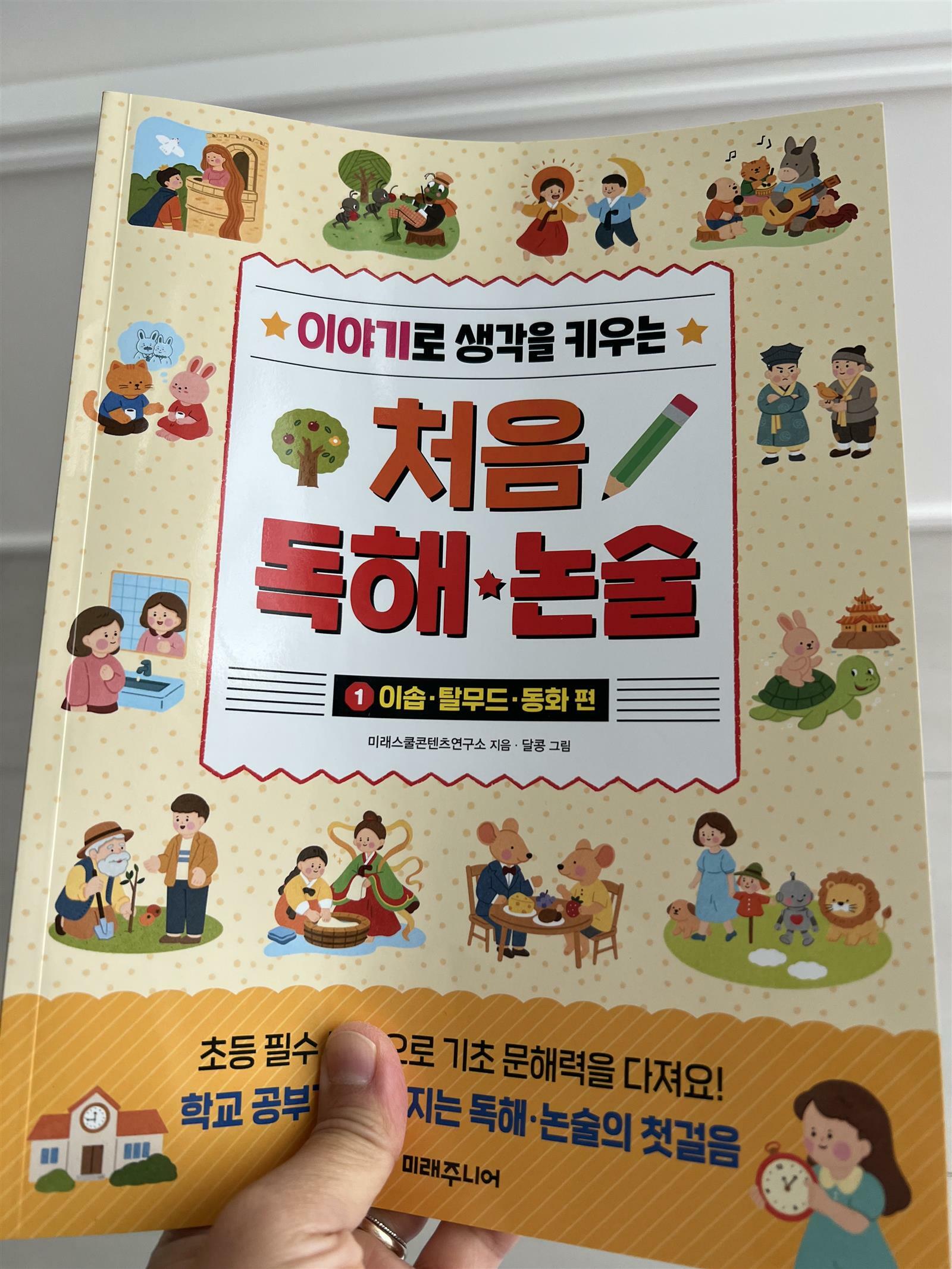 출판사로부터 도서를 제공받아 직접 읽고 작성한 리뷰입니다. '처음 독해 논술' 1권 이솝,탈무드,동화 편 책을 살펴보았습니다. 이 책은 미래 주니어 출판사에서 출간한 독해 논술 교재입니다. 책이 얇은 편이고 아이들이 읽기 좋은 크기의 글씨로 깔끔한 교재입니다. 특히 초등 저학년아이들이나 예비초 아이들이 하루에 하나씩 해보기 좋습니다. 교재를 펼치면 하루 한장으로 끝납니다. 대신 한 쪽 분량의 글밥을 소리내서 읽도록 시킵니다. 이 부분이 정말 마음에 들더라구요. 저희 집 둘째가 한글읽기 독립을 했지만 꾀가 생겨서 소리내서 읽는 것을 너무 싫어합니다. 그림책 한 권을 소리내서 읽는 다는 것은 정말 쉽지 않습니다. 그래서 이렇 교재를 통해 적은 분량을 읽도록 시킨다면 아이도 엄마도 부담이 줄어드는 것 같습니다. 소리내서 읽어야 아이가 글에 대한 이해도 잘 되고, 문해력도 향상되는 것 같습니다. 적은 분량을 매일 3번 읽고 나면 나머지 문제들은 쉽게 풀 수 있습니다. 문제는 4지선다형의 문제가 아닌 직접 단어를 쓰고, 자신의 생각이나 경험도 간단히 적도록 되어 있습니다. 교재 제목처럼 독해와 논술을 함께 시작하기 좋은 책인 것 같아요. 자연스럽게 문장의 흐름도 이해하고, 적절한 어휘공부도 되는 것 같아서 초등 저학년 아이들에게 추천합니다. 책 읽기 귀찮아하는 아이들도 있는데 이런 간단한 교재를 통해 흥미를 주고, 쉽게 하루 공부도 끝낼 수 있다는 것도 경험시켜 주면 좋을 것 같습니다. #미래주니어 #처음독해논술 #이야기로생각을키우는 #미래스쿨콘텐츠연구소 #도치맘서평 #이솝탈무드동화