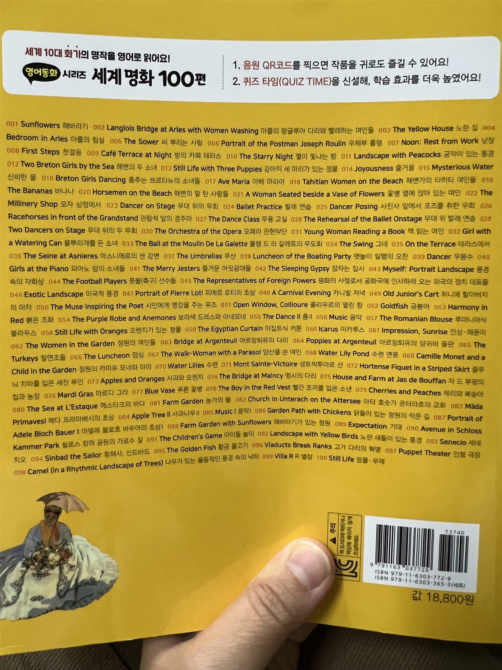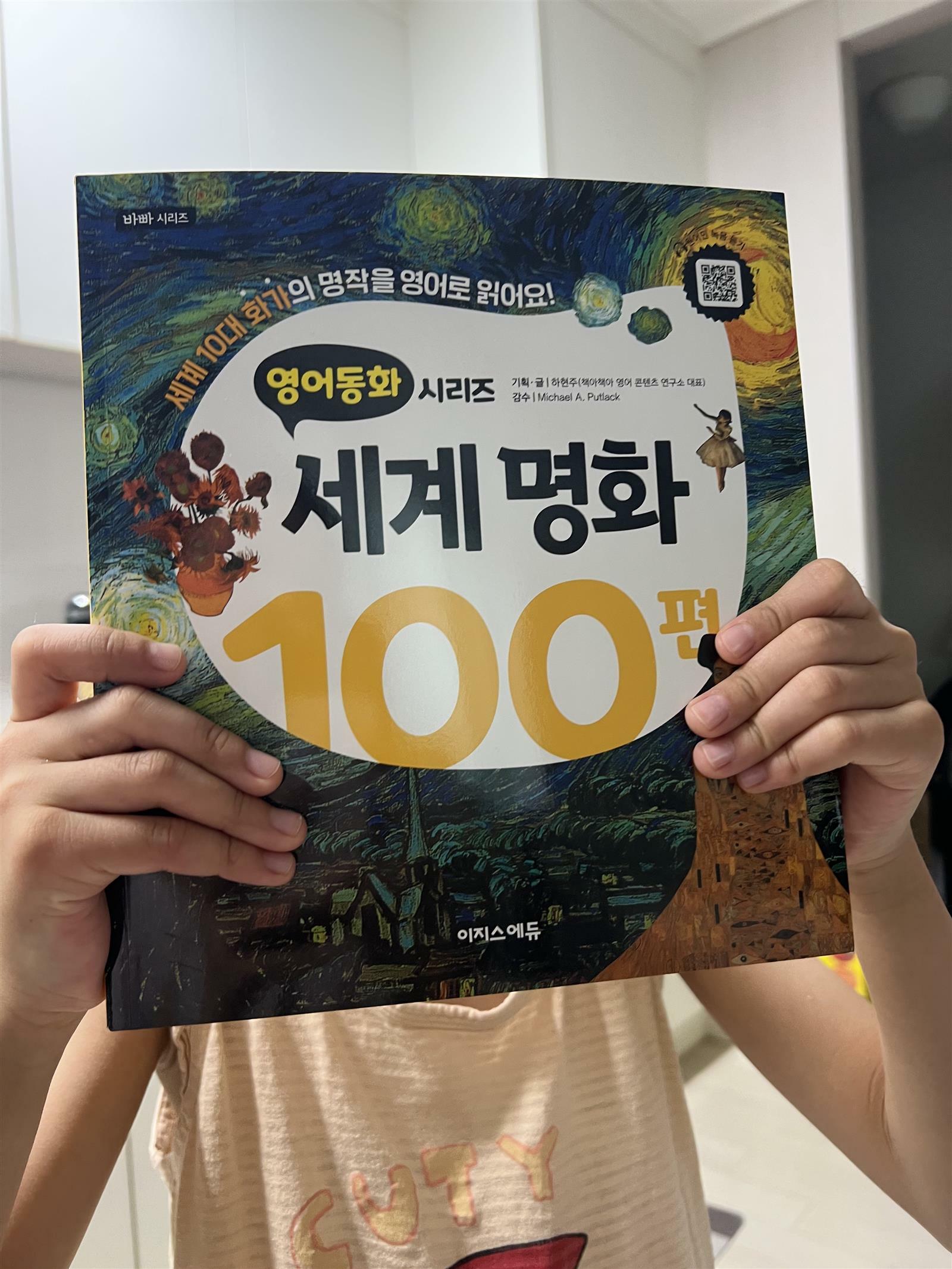출판사로부터 도서를 제공받아 직접 읽고 작성한 리뷰입니다. '영어동화 시리즈 세계명화100편' 책을 읽어 보았습니다. 이번 책은 명화도 감상하고 영어공부도 할 수 있는 일석이조의 효과를 가져가는 책입니다. 아이가 소리내어 읽기 연습이 충분해야 하는데 사실 글밥있는 책은 너무 힘들고, 그림책은 조금 쉽다고하니 걱정이었습니다. 그런데 이 책을 보니 아이 영어읽기에 안성맞춤이더라구요. 명화도 감상하고, 명화를 설명하는 글의 내용도 하루 한장으로 읽어보기 딱 좋았습니다. 큐알코드가 있어서 원어민의 발음도 직접 들을 수 있으니 평소에는 많이 들어보면 좋을 것 같더라구요. 무엇보다 명화를 한글로 설명해주는 내용도 간단히 있어서 아이들이 그림 이해를 하기에 좋습니다. 영어로 읽어보기에 글밥이나 폰트크기도 적당합니다. 내용이 유치하지 않아서 초등 아이들도 읽기 연습하기 적당합니다. 먼저 큐알로 듣기 연습을 하고, 눈으로 따라 읽어봅니다. 자신감이 생기면 스스로 읽고 녹음해보기도 하면 즐겁게 영어공부를 할 수 있습니다. 저도 아이와 읽어보기를 했습니다. 녹음하다보니 조금 긴장했는지 실수한 부분도 있지만, 아이가 해 볼만 하다는 자신감을 가지게 되어 기쁘더라구요. 요즘 영어정체기가 와서 힘들었는데 일단 이 책으로 명화도 감상하고, 영어읽기 연습부터 다시 시작해 보려고 합니다. 총 100편이라서 습관 잡기에도 좋고, 아이들이 어렵지 않게 시작할 수 있다는 점이 장점입니다. 한 페이지에 내용도 있고, 키워드까지 챙길 수 있습니다. 퀴즈타임으로 한 문제를 풀어보면서 내용이해도 확인 할 수 있네요. 부담없이 할 수 있는 양이라서 슬쩍 아이들에게 들이밀기 좋습니다. 오늘부터 100일 습관 시작해보려고 합니다. 함께 하면 좋을 것 같아서 적극 추천합니다. #세계명화 #영어동화100편 #영어리딩 #리더스 #초등영어 #어린이영어 #독해 #초등독해 #이지스에듀 #바빠시리즈 #세계명화 #반고흐 #고갱 #마티스 #클림트 #드가 #초2영어 #초4영어 #영어100편 #바쁜초등학생 #바빠초등영어 #초등영어 #바빠시리즈 #책세상 #맘수다 #책세상맘수다카페