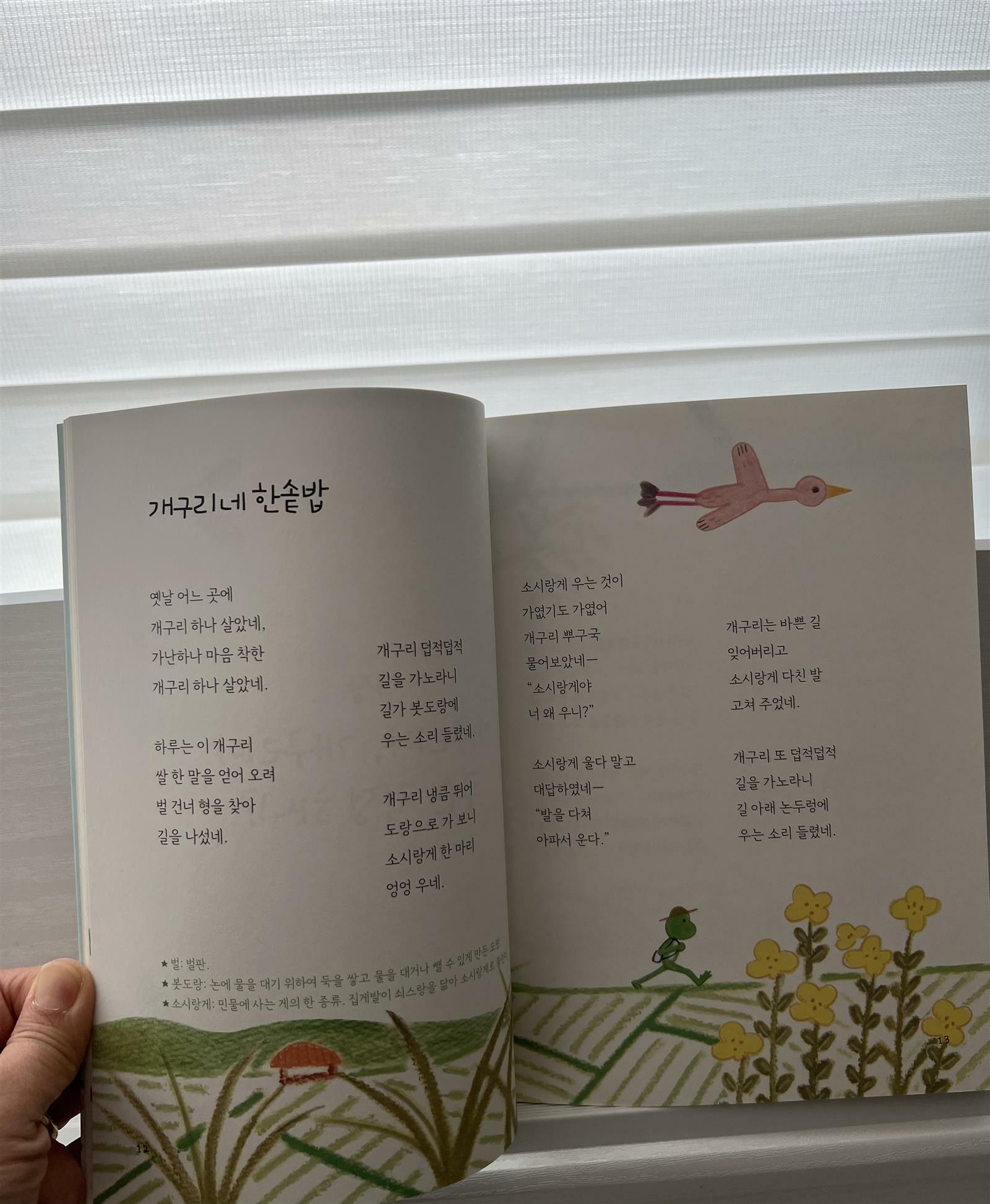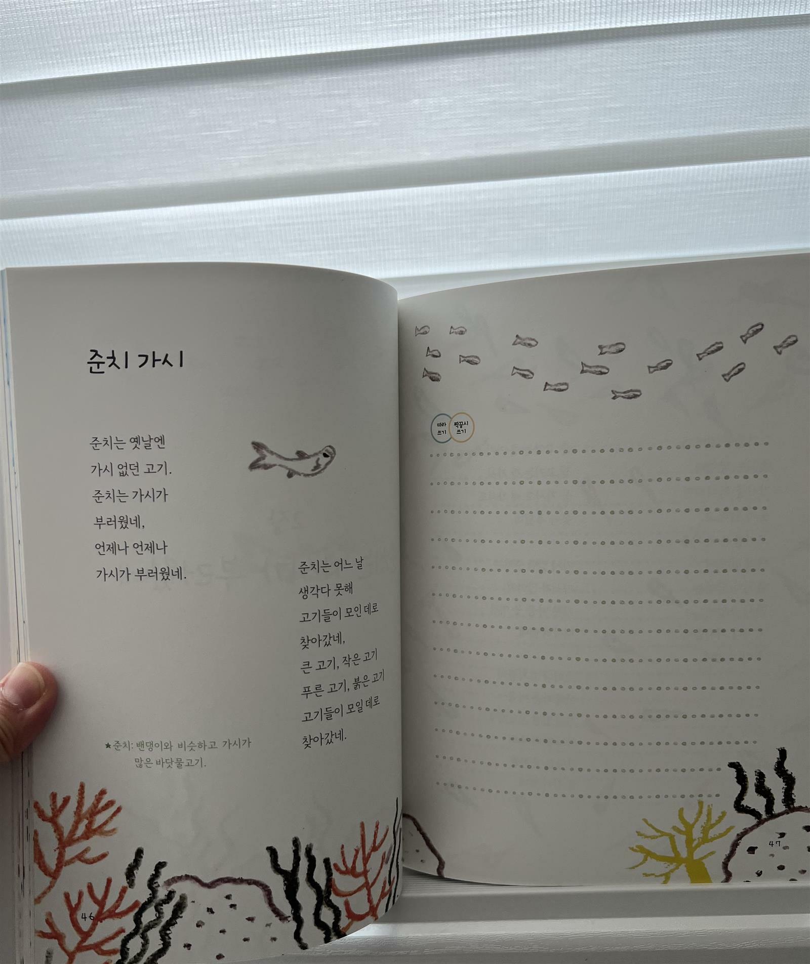 ‘마음이 예뻐지는 백석 동시, 따라 쓰는 짝꿍시’ 책을 보았습니다. 평소에 아이에게 동시를 따라쓰게 하는데 백석 동시는 이번 책을 통해 접하게 되었습니다. 백석 동시의 특징은 동화시 인 것 같습니다. 평소에 동화시를 접하지 못했는데 이번 기회에 읽어 볼 수 있어서 좋았습니다. 시처럼 운율이 있어서 길지만 술술 읽어나갈 수 있습니다. 이야기가 있어서 아이들이 집중하며 푹 빠져드는 시입니다. 마치 한 편의 동화를 본 듯한 느낌이 듭니다. 읽어가면서 그림이 머릿속에 그려지는 듯 했습니다. 중간 중간 옛말이나 사투리가 많이 나오는데 은근히 재미있습니다. 솔직히 잘 모르는 단어가 많은데 다행히 해설이 달려있어서 아이들과 보기 수월합니다. 스스로 읽기 독립힌 아이들은 천천히 시를 음미 하며 읽어보기 좋습니다. 책보다는 긴 흐름이 아니라서 짧은 시간에도 동시에 푹 빠져 볼 수 있다는 이점이 있네요. 마치 동화를 보는 듯한 동화시라서 그런지 누구나 좋아 할 것 같습니다. 평소에 동시를 자주 접해보지 않은 아이들도 거부감 없이 읽을 수 있는 시집입니다. 아이들을 좋아했다는 시인 백석님의 다정함이 느껴지는 시들입니다. 어른도 함께 보면 좋은 시집이라서 집마다 꼭 소장해서 읽어보시길 추천합니다. 긴 동화시는 일부분만 발췌해서 따라쓰기 하더록 되어 있습니다. 아이들과 함께 따라써보면서 동화시의 매력에 빠져 보시길 추천합니다. 출판사로부터 도서를 제공받아 직접 읽고 작성한 리뷰입니다. #마음이예뻐지는백석동시 #따라쓰는짝꿍시 #어린이나무생각 #백석 #고두현 #도치맘서평