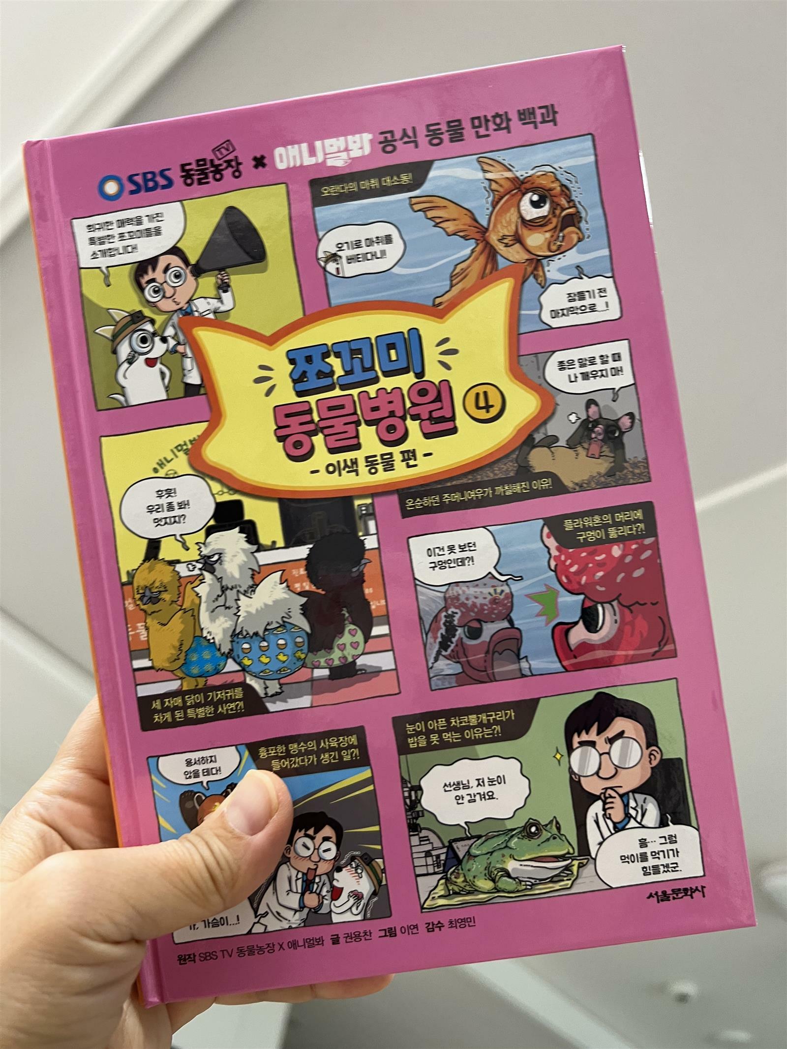 쪼꼬미 동물병원 4권을 읽어 보았습니다. 예전에 도사관에서 아이가 1권을 골라와서 재미있게 보는 걸 봤는데, 벌써 4권이 나왔습니다. 평소에 애완동물이나 동물들에게 관심이 많은 아이라서 이 책을 마음에 들어 하더라구요. 이 책은 동물농장 프로그램 자문위원인 최영민 수의사 감수와 추천 도서입니다. 그래서 현실적이면서도 재미있는 동물 이야기를 엿볼 수 있습니다. 동물들의 상처를 적절하게 치료해주는 이야기 인데 동물 좋아하는 친구들이라면 재미있게 볼 수 있을 것 같네요. 책의 구성은 만화 형식이고, 이야기 끝에 관련 동물의 실사와 정보를 알려줍니다. 이야기로 끝나는 것이 아니라 진짜 동물의 정보도 배울 수 있어서 좋습니다. 이번 4권에서는 이색동물을 다루고 있어서 더욱 특별하다고 생각합니다. 평소에 보기 힘든 동물들 이야기라서저도 보면서 참 신기했습니다. 총 10마리의 이색동물 이야기를 보면서 아이도 엄마도 재미있을 것 같네요. 관련 영상을 찾아보면 더 기억에 남고 좋을 것 같습니다. 책 시리즈는 주제별로 나눠있어서 1권부터 보지 않아도 상관 없을 것 같아요. 아이가 관심있어하는 동물 편부터 읽어나가면 좋을 것 같습니다. 어렵지 않게 잘 설명하고 있어서 초등 저학년도 재미있게 읽을 수 있을 것 같습니다. 동물에 관심이 많은 친구들에게 꼭 추천해 드리고 싶은 책입니다. 컬처블룸응 통해 출판사로부터 도서를 제공받아 직접 읽고 작성한 리뷰입니다. #쪼꼬미동물병원 #서울문화사 #이색동물편 #컬처블룸 #컬처블룸리뷰단
