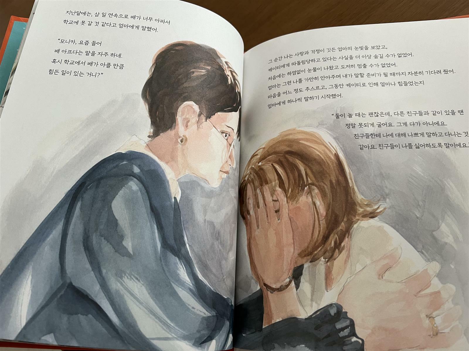 ‘모니카와 케이티’ 그림책을 보았습니다. 이 책은 정서적 괴롭힘에 대해 그려놓은 책입니다. 주인공이 어떻게 대처해 나가는지 자세히 볼 수 있어서 좋은 그림책입니다. 옮긴이가 강빈맘이라서 더욱 추천하고 싶은 책입니다. 강빈맘의 책을 읽은 적이 있는데 정말 속시원했습니다. 어른들의 관계에서도 여전히 정서적 괴롭힘이 있습니다. 그리고 어른들도 대처가 쉽지 않습니다. 그런데 아이들은 얼마나 힘들까요? 아이들은 구체적인 대처 방안과 단단하게 마음을 키워 나가야 하는 것 같습니다. 이 책의 주인공은 유치원때부터 친했던 친구를 믿었지만 더이상 친구가 아니란 것을 배웠습니다. 나를 무시하고 제멋대로 대하는 사람에게 어떻게 말해야 하는지도 나옵니다. 아이들과 함께 읽으면서 이야기 나누기에 좋은 책입니다. 이러한 상황에서 어떻게 해야 하는지 대부분 잘 모릅니다. 막상 같은 상황에 닥치면 당황하게 됩니다. 저희 아이도 학교에서 친구들 이야기를 하면서 속상해 할 때가 많습니다. 순간 대처능력는 연습과 올바른 인식이 있을 때 가능 한 것 같습니다. 나를 함부로 하는 친구는 친구가 아님을 알아야 하는 것 같습니다. 아이들을 위한 책이지만 어른들도 함께 보면서 이해하고 알아야 하는 것 같아요. 자녀가 초등입학을 앞둔 부모님들께 추천해 드리고 싶은 책입니다. 정확한 상황을 판단하고 대처하는 것이 중요 한 것 같아요. 출판사로부터 도서릉 제공받아 직접 읽고 작성한 리뷰입니다. #컬처블룸 #컬처블룸리뷰단 #모니카와케이티 #서교책방 #트루디루드위그